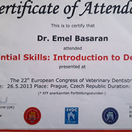 Dr. Emel Başaran, 1990 yılında Uludağ Üniversitesi Veteriner Fakültesinden mezun olmuştur. Mezuniyet sonrası Amerika Birleşik Devletlerinde 1992-1994 yılları arasında Aquajito Veterinary Hospital Monterey California’da visiting veteriner hekim olarak mesleki bilgi, görgü ve becerilerini geliştirmiştir.